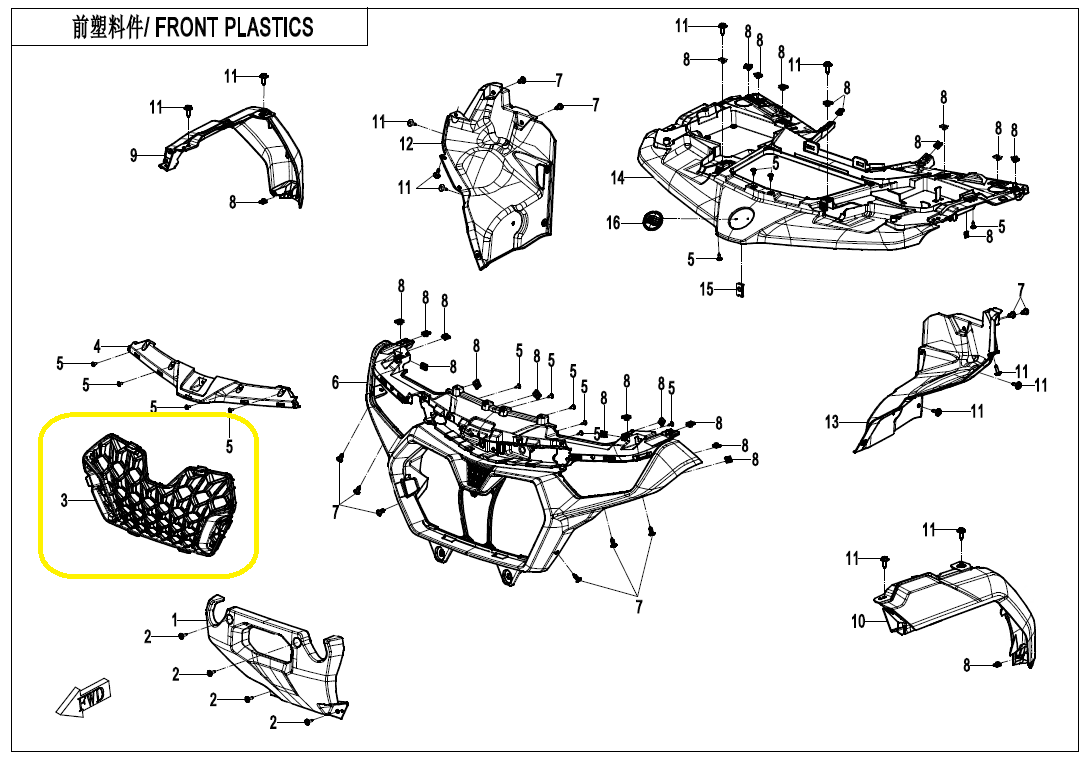 | Block: FRONT PLASTICS - F04-1 For: 2025, ATV, CF800AU-3 |